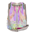 チェーンの長さを変えて、手持ち、肩掛け、クロスボディの3WAYで使用できるスタイル。Christian Louboutin(クリスチャン・ルブタン)によるシルバーの「Marie Jane」バケットバッグ。シグネチャーであるスパイクスタッズがあしらわれています。 艶のあるイリディセントのPVC素材を使用。トレードマークであるレッドカラーがアクセントを添えるグリッターで覆われたレザーと、チェーンショルダーが組み合わされたストラップが配されています。